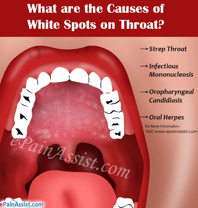In addition to infection sometimes these white patches can be a result of an injury from a chemical injury to the throat. Strep throat is a contagious bacterial condition that causes white spots in the throat. The most common cause is an infection.